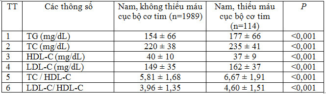 Ở bệnh nhân thiếu máu cục bộ cơ tim (ischemic heart disease: IHD), trong một nghiên cứu trên 114 nam giới bị thiếu máu cục bộ cơ tim so với 1989 người không thếu máu cục bộ cơ tim, Lemieux I và cộng sự, 2001 [5] thấy rằng các thông số lipid, lipoprotein và tỷ số của chúng đều tăng một cách có ý nghĩa thống kê rất rõ rệt, riêng HDL-C giảm rõ rệt (Bảng 2).