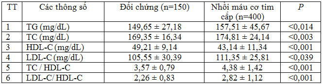 Ở bệnh nhân nhồi máu cơ tim cấp (acute myocardial infarction: AMI), trong một nghiên cứu trên 400 nam giới bị nhồi máu cơ tim cấp so với 150 người không bị nhồi máu cơ tim, Shrivastava AK và cộng sự, 2015 [6] đã thấy rằng các thông số lipid, lipoprotein và tỷ số của chúng đều tăng một cách có ý nghĩa thống kê rất rõ rệt, riêng HDL-C giảm rất rõ rệt (Bảng 3).