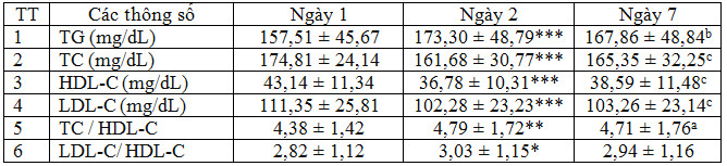 Ghi chú: so sánh giữa ngày 2 và ngày 1; *P<0,05, **P<0,01. ***P<0,001; so sánh giữa ngày 3 và ngày 1: aP<0,05, bP<0,01, cP<0,001.