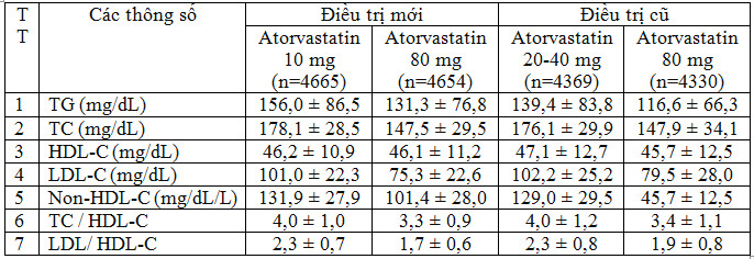 Ở các bệnh nhân bị bệnh tim mạch (cardiovascular disease: CVD), theo dõi sự thay đổi các thông số lipid, lipoprotein và các tỷ số của chúng trong quá trình điều trị bằng statin trong 12 tháng, Kastelein JJP và cộng sự, 2008 [3] đã thấy rằng, các thông số lipid đều có xu hướng giảm theo thời gian điều trị ở cả bệnh nhân bắt đầu được điều trị và đã được điều trị (Bảng 5).