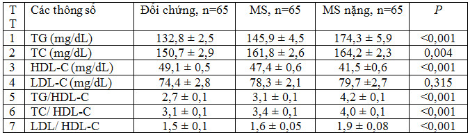 Nghiên cứu trên 130 bệnh nhân có hội chứng chuyển hóa (metabolic syndrome: MS) ở mức độ vừa (MS) và nặng (severe MS) theo mức độ của 5 tiêu chuẩn (vòng bụng, huyết áp, TG, HDL-C, và đái tháo đường), Bhagyashree N và cộng sự 2018 [1] đã thấy rằng các thông số lipid, lipoprotein và các tỷ số của chúng tăng một cách rất rõ rệt theo mức độ nặng của bệnh so với nhóm đối chứng, riêng HDL-C giảm rất rõ rệt và LDL-C không thay đổi (Bảng 6).