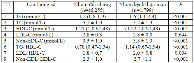 Ở bệnh nhân bị bệnh thận mạn (chronic kidney disease: CKD), các thông số lipid, lipoprotein và tỷ số của chúng đều tăng một cách có ý nghĩa rất rõ rệt, riêng HDL-C giảm và LDL-C không thay đổi (Bảng 7).