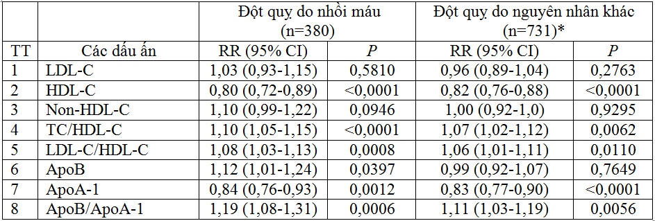 Bảng 5. Tỷ số nguy cơ tương đối (RR: relative risk) đã được điều chỉnh theo tuổi và giới của đột quỵ do nhồi máu (infarct stroke: IS) và đột quỵ do các nguyên nhân khác liên quan đến ApoB, ApoA-1, tỷ số ApoB/ApoA-1 và các lipoprotein (Walldius G, 2006 [8]).